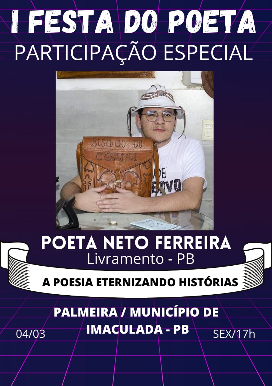 O cordelista e professor Neto Ferreira, de Livramento (PB), participará da I Festa do Poeta no distrito de Palmeira, município de Imaculada, que será realizada em 04 de março, sob a coordenação do poeta José Higor. “Estarei representando o Cariri e minha terra Livramento nesta noite de lançamentos e declamações”, disse Neto.